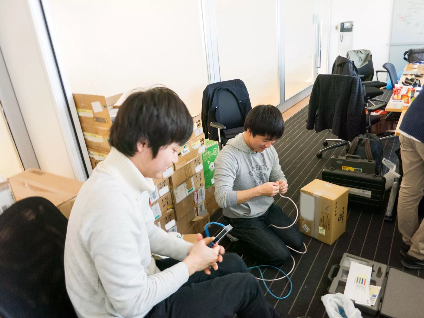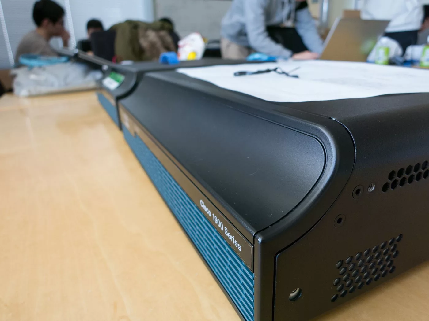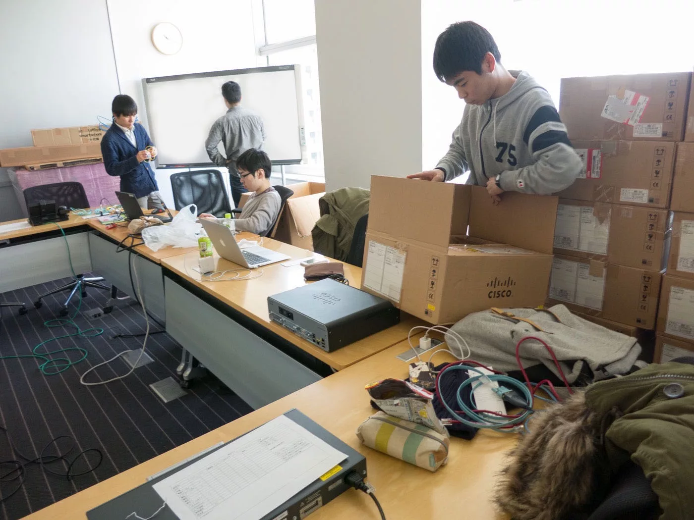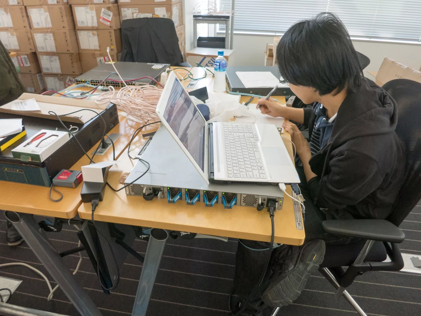 大会で使用するルータやスイッチの動作確認と検品作業をしています。