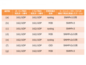 下の表についてSNMPに関する記述として最も正しい選択肢を答えてください。