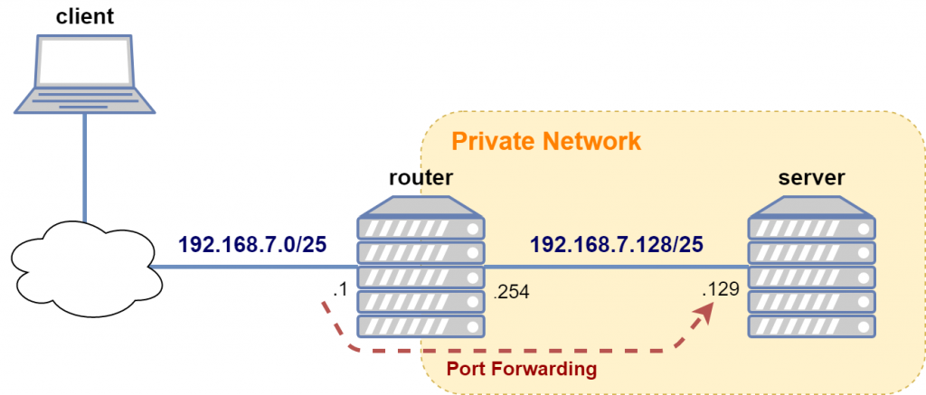 ですが、192.168.7.129というのは、NAT内でのIPアドレスなので、NATの外から直接接続することはできません。本来であれば、192.168.7.1と表示されてほしいはず。192.168.7.1にアクセスした後に192.168.7.129にパケットが転送されてくれないと困るため、routerに対してrouterが着信した通信を転送する設定(Port forwarding)を入れる必要もありそうです。また、問題文からserverにもiptablesの設定が入っていそうなので、その設定も追記をする必要があるかもしれません。