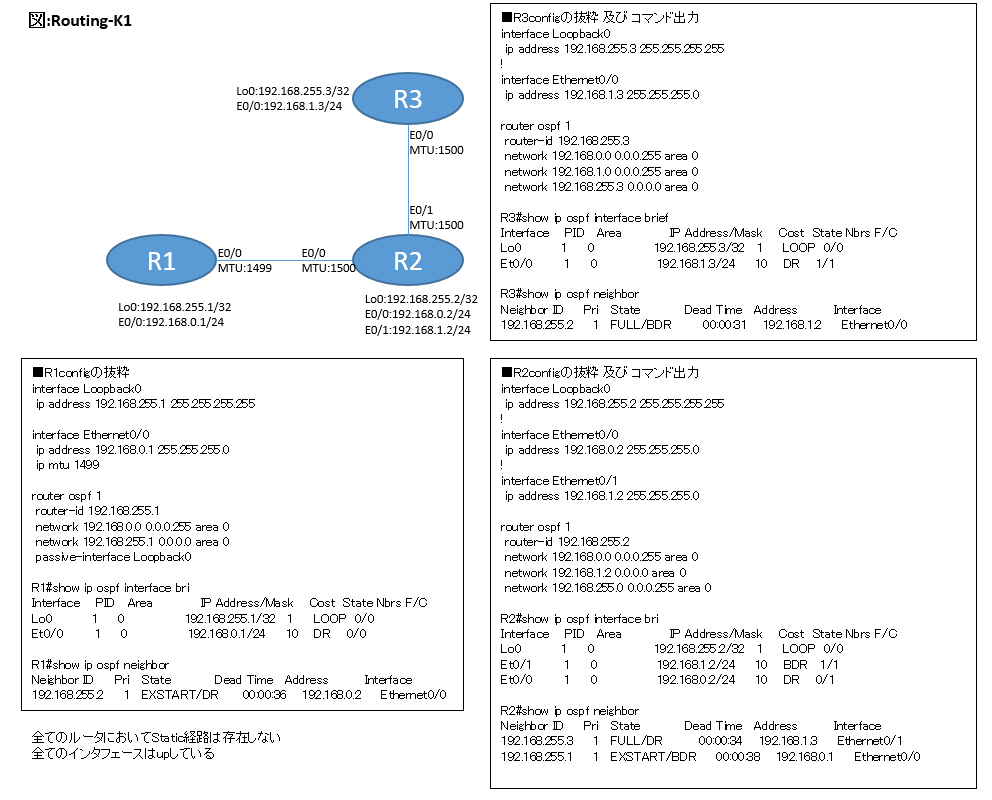 • このネットワークはR1, R2間のOSPFがMTU mismatchでOSPFのneighbor関係を確立されていない以外は正常な設定です。