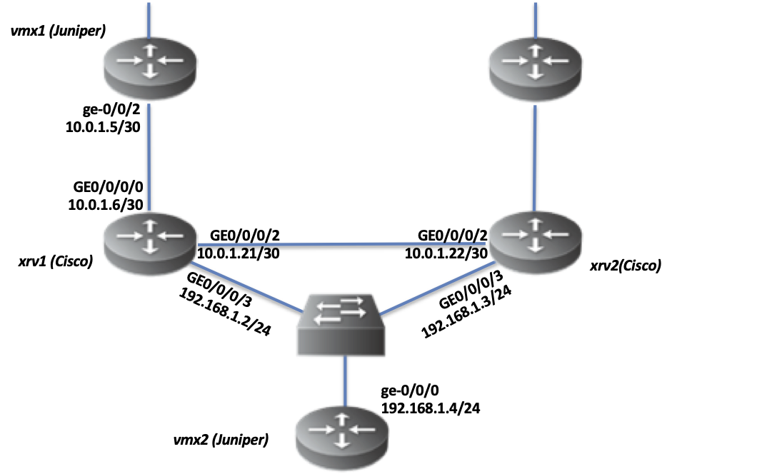 • C: vmx1とxrv1の間のvlan設定が間違っている
