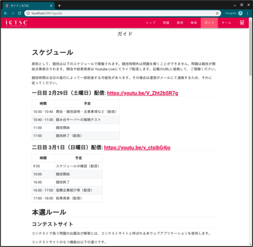 1. ログインに成功すると、今大会のスケジュールや本選でのルールなどが表示されます。