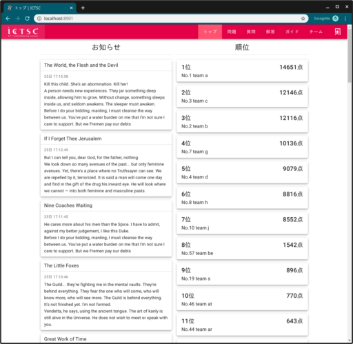 1. 画面上部の「トップ」をクリックすると、運営からのお知らせと現在の各チームの順位が表示されます。