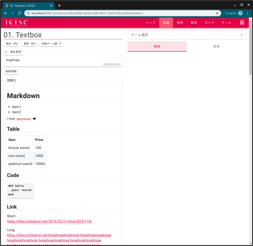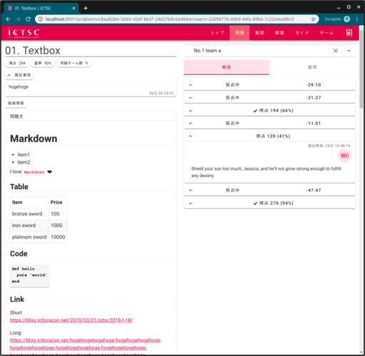 このページでは、左側に問題の詳細情報が表示され、右側には現在の各チームからの解答と質問が表示されるようになっています。
