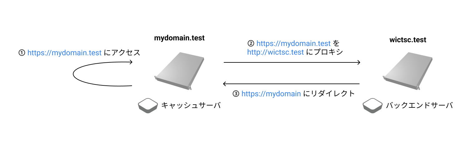 サービスが提供しているドメインではなく最近新たに取得した mydomain.test で接続したいと考えて設定をしたがなぜか繋がらない、cache 側からアクセスできるようにして欲しい。